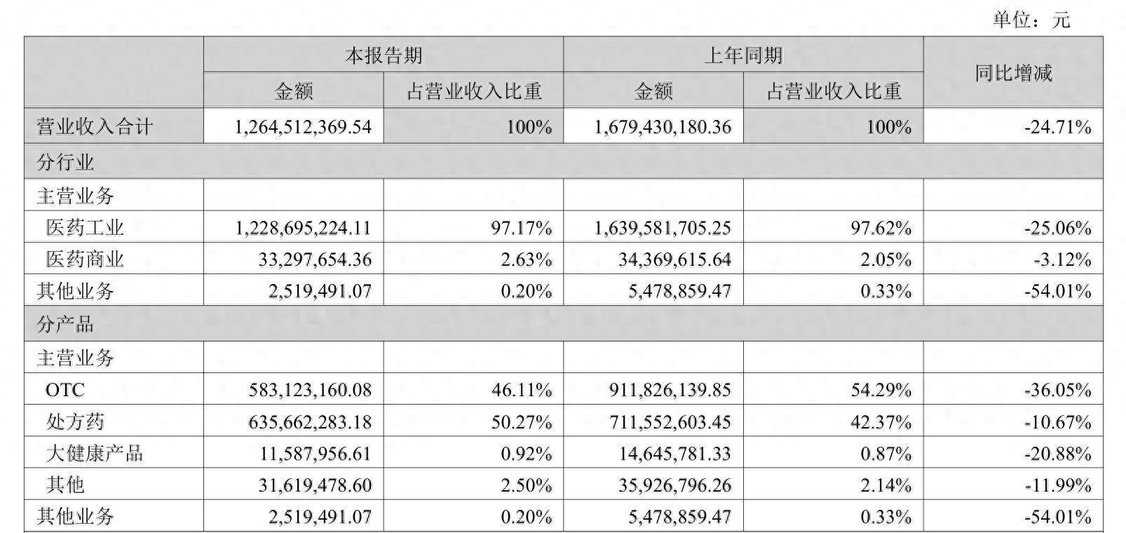 分产品来看,上半年,九芝堂OTC、处方药、大健康产品、其他产品及其他业务营收同比全线下滑,降幅分别为36.05%、10.67%、20.88%、11.99%、54.01%。